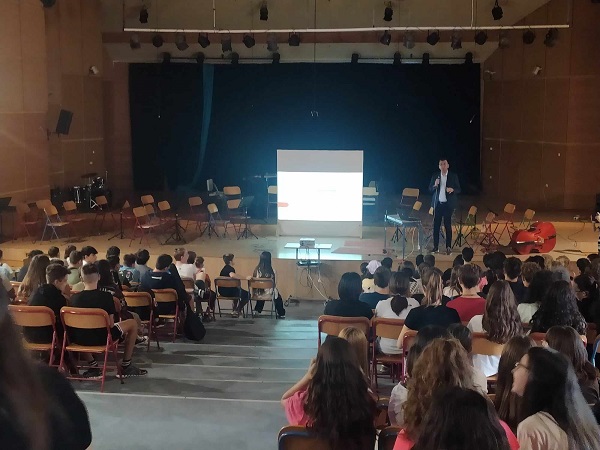 Στη συνέχεια τα παιδιά πέρασαν στην αίθουσα εκδηλώσεων για να παρακολουθήσουν την παρουσίαση του διατροφολόγου κ. Κωνσταντίνου Μητουσούδη με θέμα «Η Μεσογειακή διατροφή σε μαθητές και αθλούμενους». Μετά την παρουσίαση ακολούθησε συζήτηση με τον διατροφολόγο, ο οποίος απάντησε στις ερωτήσεις των μαθητών μας, που τους απασχολούσαν, πάνω στο θέμα. Οι ερωτήσεις καταγράφηκαν από πριν και συγκεντρώθηκαν από τους καθηγητές του σχολείου, Μαλέτσκα Ειρήνη και Καλπάκης Βασίλειος. Ο κ. Κοσμίδης βοήθησε ώστε στην αίθουσα να έχουμε ότι χρειαζόμασταν.
